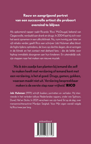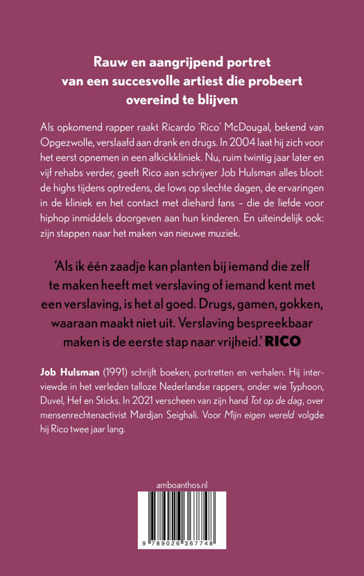 Dit is het verhaal van Ricardo 'Rico' McDougal, bekend van de rapformatie Opgezwolle. Hij gunt de lezer een unieke inkijk in de vroege Nederlandse hiphopscene en bovenal in het leven van een artiest die gebukt gaat onder zijn verslaving. Als opkomende rapper raakt Rico verslaafd aan drank en drugs. In 2004 laat hij zich voor het eerst opnemen in een afkickkliniek, waar hij na drie weken vertrekt. 'Het werk was gedaan, daar was ik echt van overtuigd. Ik voelde me on top of the world,' vertelt hij nu. Twintig jaar later en vijf rehabs verder. Rico geeft aan schrijver Job Hulsman alles bloot: de highs tijdens optredens, de lows op slechte dagen, de ervaringen in de kliniek, het contact met diehard fans - die de liefde voor hiphop inmiddels doorgeven aan hun kinderen - en zijn stappen richting het maken van nieuwe muziek. Mijn eigen wereld is een aangrijpend portret van een succesvolle artiest die achter de schermen een eenzame strijd levert. Job Hulsman volgde Rico gedurende twee jaar. 'Rico neemt, net als ik, meer tot zich dan goed voor hem is. Mede daardoor schrijft hij van die mooie teksten. Maar als je niet geleerd hebt dat te reguleren wordt het een probleem.'- Typhoon