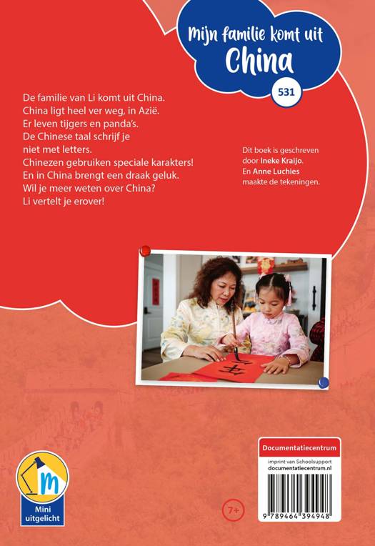 De familie van Li komt uit China. China ligt heel ver weg, in Azië. Er leven tijgers en panda’s. De Chinese taal schrijf je niet met letters. Chinezen gebruiken speciale karakters! En in China brengt een draak geluk. Wil je meer weten over China? Li vertelt je erover!