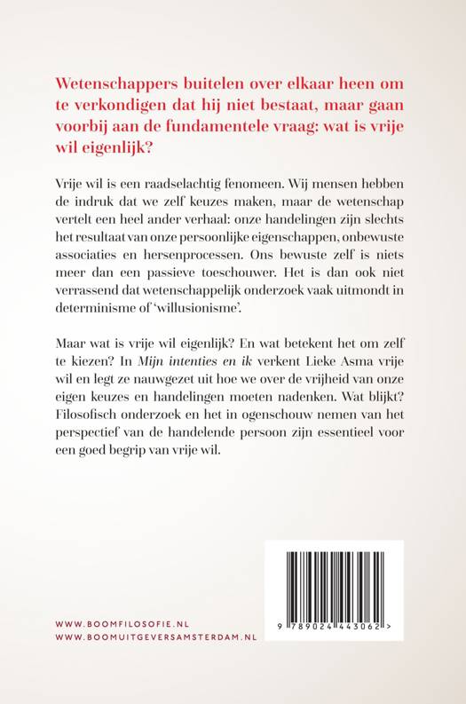 Maar wat is vrije wil eigenlijk? En wat betekent het om zelf te kiezen? In Mijn intenties en ik verkent Lieke Asma vrije wil en legt ze nauwgezet uit hoe we over de vrijheid van onze eigen keuzes en handelingen moeten nadenken. Wat blijkt? Filosofisch onderzoek en het in ogenschouw nemen van het perspectief van de handelende persoon zijn essentieel voor een goed begrip van vrije wil.