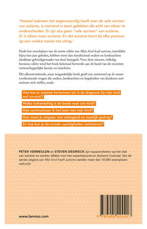 Hét basisboek over kinderen en autisme Concrete antwoorden op de meest voorkomende vragen die ouders van kinderen met autisme zich stellen, met talrijke voorbeelden en praktisch bruikbare tips. Mijn kind heeft autisme is door de jaren heen uitgegroeid tot het standaardwerk over autisme voor ouders, leerkrachten en hulpverleners. Peter Vermeulen en Steven Degrieck, beiden topautoriteiten op het vlak van autisme, vertalen in dit boek de recentste wetenschappelijke inzichten op een vlot leesbare en praktische manier naar een breed publiek.