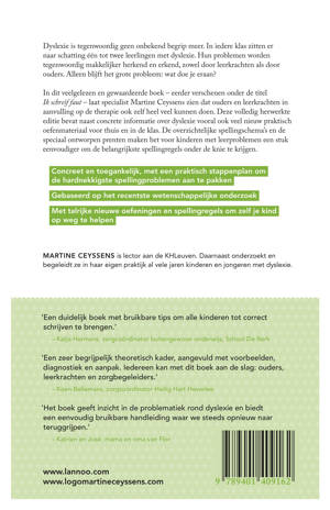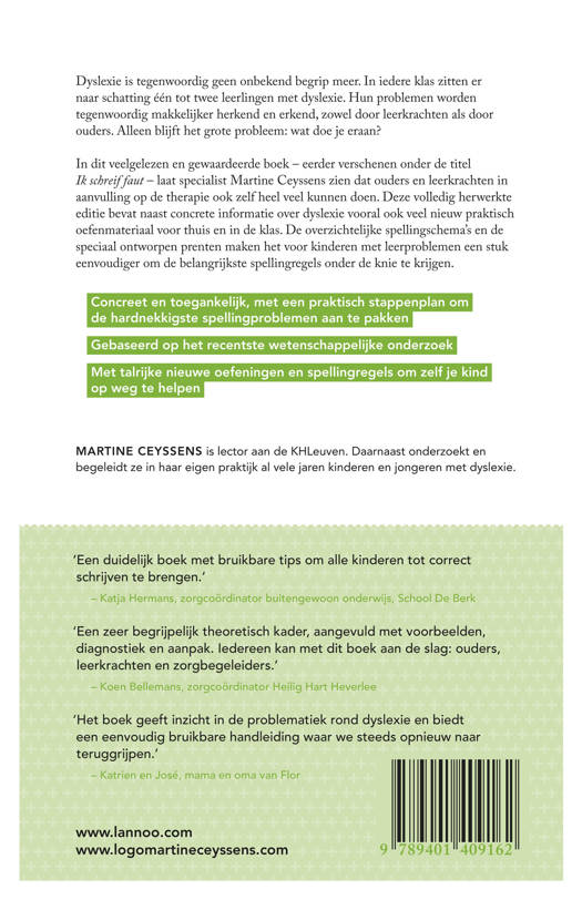 In dit veelgelezen en gewaardeerde boek - eerder verschenen onder de titel Ik schreif faut - laat specialist Martine Ceyssens zien dat ouders en leerkrachten in aanvulling op de therapie ook zelf heel veel kunnen doen. Deze volledig herwerkte editie bevat naast concrete informatie over dyslexie vooral ook veel nieuw praktisch oefenmateriaal voor thuis en in de klas. De overzichtelijke spellingsschema's en de speciaal ontworpen prenten maken het voor kinderen met leerproblemen een stuk eenvoudiger om de belangrijkste spellingregels onder de knie te krijgen.