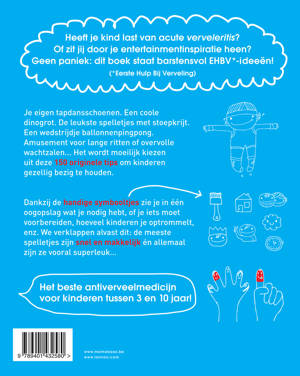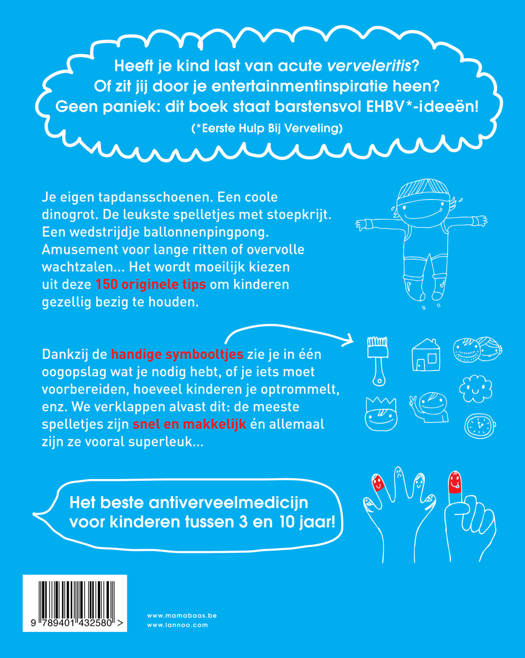 150 topideetjes voor saaie momenten Heeft je kind last van acute verveleritis? Of zit jij door je entertainmentinspiratie heen? Geen paniek: dit boek staat barstensvol EHBV*-ideeën! (*Eerste Hulp Bij Verveling) Je eigen tapdansschoenen. Een coole dinogrot. De leukste spelletjes met stoepkrijt. Een wedstrijdje ballonnenpingpong. Amusement voor lange ritten of overvolle wachtzalen... Het wordt moeilijk kiezen uit deze 150 originele tips om kinderen gezellig bezig te houden. Dankzij de handige symbooltjes zie je in één oogopslag wat je nodig hebt, of je iets moet voorbereiden, hoeveel kinderen je optrommelt, enz. We verklappen alvast dit: de meeste spelletjes zijn snel en makkelijk én allemaal zijn ze vooral superleuk... Het beste antiverveelmedicijn voor kinderen tussen 3 en 10 jaar!