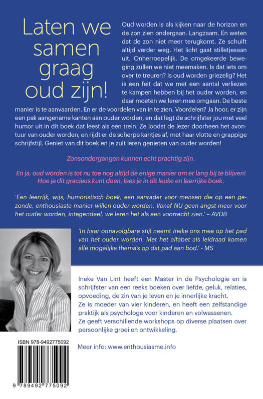 Oud worden is als kijken naar de horizon en de zon zien ondergaan. Langzaam. En weten dat de zon niet meer terugkomt. Ze schuift altijd verder weg. Het licht gaat stilletjesaan uit. Onherroepelijk. De omgekeerde beweging zullen we niet meemaken. Is dat iets om over te treuren? Is oud worden griezelig? Het is een feit dat we met een aantal verliezen te kampen hebben bij het ouder worden, en daar moeten we leren mee omgaan. De beste manier is te aanvaarden. En er de voordelen van in te zien. Voordelen? Ja hoor, er zijn een pak aangename kanten aan ouder worden, en dat legt de schrijfster jou met veel humor uit in dit boek dat leest als een trein. Ze loodst de lezer doorheen het avontuur van ouder worden, en rijdt er de scherpe kantjes af, met haar vlotte en grappige schrijfstijl. Geniet van dit boek en je zult leren genieten van ouder worden!