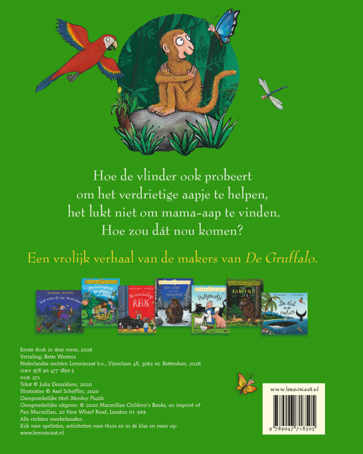 Maar hoe de vlinder ook probeert om het verdrietige aapje te helpen, het lukt niet om mama-aap te vinden. Hoe zou dat nou komen?