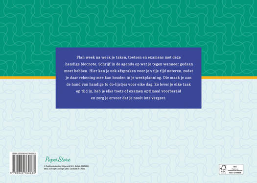 Plan week na week je taken, toetsen en examens met deze handige blocnote met uitscheurbare bladen. Schrijf in de agenda op wat je tegen wanneer gedaan moet hebben. Hier kan je ook afspraken voor je vrije tijd noteren, zodat je daar rekening mee kan houden in je weekplanning. Die maak je aan de hand van handige to do-lijstjes voor elke dag. Zo lever je elke taak op tijd in, heb je elke toets of elk examen optimaal voorbereid en zorg je ervoor dat je nooit iets vergeet. Blocnote met 56 uitscheurbare weekoverzichten.
