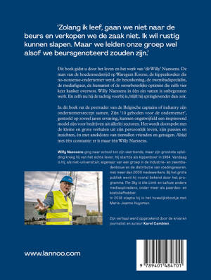 Dit boek gidst u door het leven en het werk van 'dé Willy' Naessens. De man van de hoedenwedstrijd op Waregem Koerse, de kippenkweker die no-nonsense-ondernemer werd, de betonkoning, de zwembadspecialist, de mediafiguur, de humanist of de onverbeterlijke optimist die zelfs vier keer kanker overwon. Willy Naessens in één zin vatten is onbegonnen werk. En zelfs nu hij de tachtig voorbij is, blijft hij springlevender dan ooit.