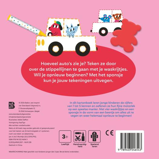 Dit boek met wasco’s leert jonge kinderen kennis maken met de cijfers van 1 tot 5. Ze oefenen hun getalbegrip en fijne motoriek op een speelse manier. Met de wasco’s kunnen ze de stippellijnen overtrekken. Op elke dubbele pagina is er ook een extra oefening voor kinderen die al wat meer uitdaging nodig hebben op het gebied van fijne motoriek. Met vier wasco’s en een sponsje in een leuke vorm om alles uit te vegen en weer helemaal opnieuw te beginnen!