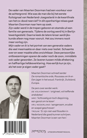 Het eerste waar schrijver en filosoof Maarten Doorman bij zijn vader aan denkt is diens voorkeur voor de achtergrond. Wie was deze bescheiden man die bij het eerste fluitsignaal van Nederland-Joegoslavië in de kwartfinale van het EK dood neerviel? In dit openhartige relaas gaat Doorman naar hem op zoek. Hij werd geboren in de tropen en tijdens de oorlog in Duitsland tewerkgesteld. Daarna keek de leraar aardrijkskunde alleen nog maar vooruit, naar de toekomst. Het verleden bestond niet meer. Er zou nooit meer oorlog zijn. Mijn vader en ik wordt daarmee tegelijk het portret van een generatie vaders die veel meemaakte en weinig over zichzelf losliet. Deze persoonlijke ontboezemingen sparen de vader noch de zoon, die inmiddels zelf vader is geworden. Ze laveren tussen milde afrekening en halfhartige liefdesverklaring.