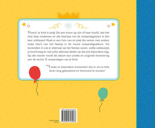 Hoera! Je kind is jarig! Zet een kroon op zijn of haar hoofd, laat het heel diep inademen en alle kaarsjes van de verjaardagstaart in één keer uitblazen! Maak er een foto van en plak die samen met andere leuke foto's van het feestje in dit mooie verjaardagenalbum. Vul bovendien in wie er allemaal op het feestje waren, welke cadeautjes je kind kreeg en wat jullie allemaal deden op die ene bijzondere dag. Op die manier wordt dit album een unieke en originele herinnering aan de verjaardagen van je kind tot en met 12 jaar. Leuke en bijzondere momenten zijn er om gekoesterd te worden en herinnerd je hele leven lang!