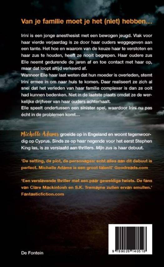 'Mijn zus'(My Sister) van Michelle Adams is een thriller in de traditie van Clare Mackintosh (Mea culpa en Ik zie jou) en S.K. Tremayne (De ijstweeling)Irini is een jonge anesthesist met een bewogen jeugd. Vlak voor haar vierde verjaardag is ze door haar ouders weggegeven aan een tante. Het hoe en waarom van de keuze haar te verstoten en haar zus te houden, heeft ze nooit begrepen. Haar oudere zus Elle neemt gedurende de jaren af en toe contact met haar op, maar altijd loopt dat noodlottig af. Wanneer Elle haar laat weten dat hun moeder is overleden, stemt Irini ermee in om naar huis te komen. Daar realiseert ze zich al snel dat het verleden van haar familie complexer is dan ze ooit had kunnen bedenken. Niet in de laatste plaats omdat ze achter de werkelijke drijfveer van haar ouders komt. Elle speelt ondertussen een sinister spel, waardoor Irini nu pas écht in de problemen komt… Michelle Adams groeide op in Engeland en woont tegenwoordig op Cyprus. Sinds ze op haar negende voor het eerst Stephen King las, is ze verslaafd aan thrillers. Mijn zus is haar debuut.'De setting, de plot, de personages. Echt alles aan dit debuut is perfect. Michelle Adams is een groot talent!' Goodreads.com
