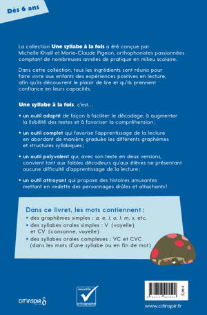 Des textes adaptés pour lire plus facilement ! Pour faciliter l’apprentissage de la lecture, les mots qui composent les histoires ont été sélectionnés en fonction de leur familiarité, de leur structure syllabique et des graphèmes* qu’ils contiennent. Plusieurs adaptations visuelles permettent de réduire la charge cognitive liée au décodage et de limiter l’encombrement perceptif. Les livrets contiennent deux fois la même histoire : dans la première version, syllabes orales, lettres muettes et graphèmes complexes sont mis en relief ; dans la seconde, ces adaptations ne sont pas présentes. Ce sont donc des outils polyvalents qui favorisent le transfert des acquis et qui conviennent à tous les enfants. Les histoires fantaisistes mettent en scène des personnages rigolos et attachants. La trame narrative captive les jeunes lecteurs tout en leur permettant de faire des prédictions. Les illustrations leur donnent aussi de nombreuses occasions de faire des inférences.