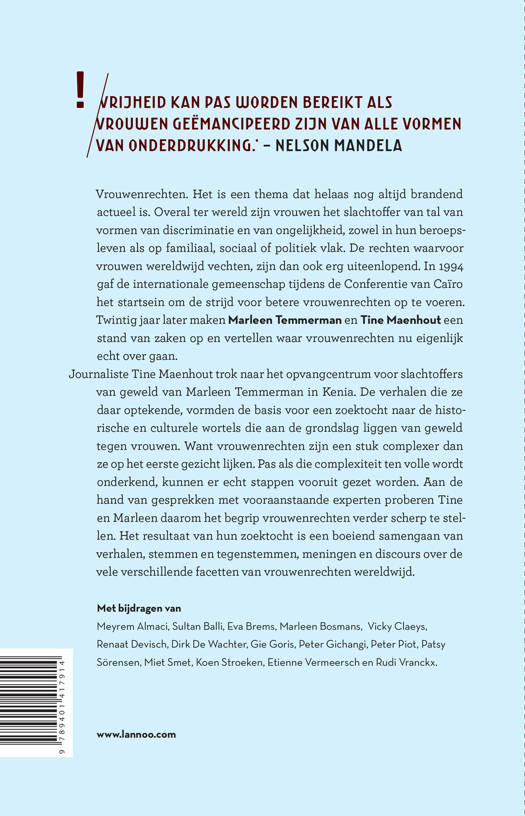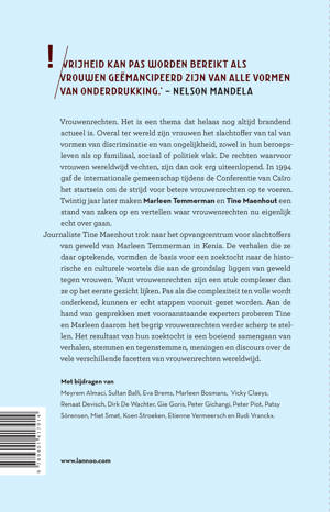 Brandend actueel thema, twintig jaar na de Conferentie van Caïro Vrijheid kan pas worden bereikt als vrouwen geëmancipeerd zijn van alle vormen van onderdrukking. - Nelson Mandela Vrouwenrechten. Het is een thema dat helaas nog altijd brandend actueel is. Overal ter wereld zijn vrouwen het slachtoffer van tal van vormen van discriminatie en van ongelijkheid, zowel in hun beroepsleven als op familiaal, sociaal of politiek vlak. De rechten waarvoor vrouwen wereldwijd vechten, zijn dan ook erg uiteenlopend. In 1994 gaf de internationale gemeenschap tijdens de Conferentie van Caïro het startsein om de strijd voor betere vrouwenrechten op te voeren. Twintig jaar later maken Marleen Temmerman en Tine Maenhout een stand van zaken op en vertellen waar vrouwenrechten nu eigenlijk echt over gaan. Journaliste Tine Maenhout trok naar het opvangcentrum voor slachtoffers van geweld van Marleen Temmerman in Kenia. De verhalen die ze daar optekende, vormden de basis voor een zoektocht naar de historische en culturele wortels die aan de grondslag liggen van geweld tegen vrouwen. Want vrouwenrechten zijn een stuk complexer dan ze op het eerste gezicht lijken. Pas als die complexiteit ten volle wordt onderkend, kunnen er echt stappen vooruit gezet worden. Aan de hand van gesprekken met vooraanstaande experts proberen Tine en Marleen daarom het begrip 'vrouwenrechten' verder scherp te stellen. Het resultaat van hun zoektocht is een boeiend samengaan van verhalen, stemmen en tegenstemmen, meningen en discours over de vele verschillende facetten van vrouwenrechten wereldwijd. Met bijdragen van Meyrem Almaci, Sultan Balli, Eva Brems, Marleen Bosmans, Vicky Claeys, Renaat Devisch, Dirk De Wachter, Gie Goris, Peter Gichangi, Peter Piot, Patsy Sörensen, Miet Smet, Koen Stroeken, Etienne Vermeersch en Rudi Vranckx.