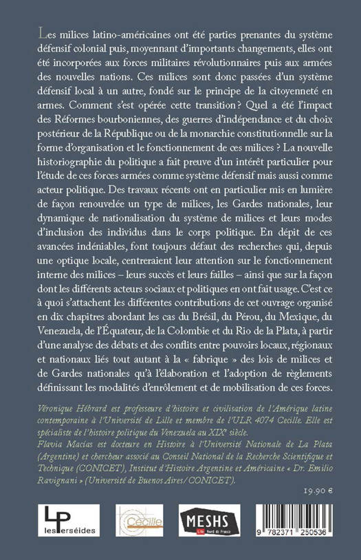 Les milices latino-américaines ont été parties prenantes du système défensif colonial puis, moyennant d’importants changements, elles ont été incorporées aux forces militaires révolutionnaires puis aux armées des nouvelles nations. Ces milices sont donc passées d’un système défensif local à un autre, fondé sur le principe de la citoyenneté en armes. Comment s’est opérée cette transition ? Quel a été l’impact des Réformes bourboniennes, des guerres d’indépendance et du choix postérieur de la République ou de la monarchie constitutionnelle sur la forme d’organisation et le fonctionnement de ces milices ?