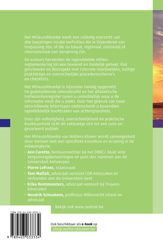 Door zijn volledigheid, overzichtelijkheid en praktische bruikbaarheid richt dit Milieuzakboekje zich tot een ruim publiek. Het Milieuzakboekje herwerkt de ingewikkelde milieureglementering tot een boeiend geheel. Het is vlot geschreven en doorspekt met concrete voorbeelden, nuttige praktijktips en overzichtelijke procedureschema’s en checklists. Het Milieuzakboekje is bijzonder handig opgesteld. De gedetailleerde inhoudstafel en het alfabetische trefwoordenregister tonen u onmiddellijk waar u de informatie vindt die u zoekt. Door het gebruik van twee verschillende lettertypes onderscheidt u bovendien ogenblikkelijk hoofdzaken van achtergrondinfo.