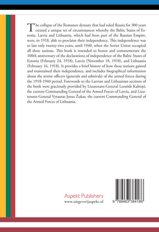 The collapse of the Romanov dynasty that had ruled Russia for 300 years created a unique set of circumstances whereby the Baltic States of Estonia, Latvia and Lithuania, which had been part of the Russian Empire, were, in 1918, able to proclaim their independence. This independence was to last only twenty-two years, until 1940, when the Soviet Union occupied all three nations. This book is intended to honor and commemorate the 100th anniversary of the declarations of independence of the Baltic States of Estonia (February 24, 1918), Latvia (November 18, 1918), and Lithuania (February 16, 1918). It provides a brief history of how these nations gained and maintained their independence, and includes biographical information about the senior officers (generals and admirals) of the armed forces during the 1918-1940 period. Forewords to the Latvian and Lithuanian sections of the book were graciously provided by Lieutenant-General Leonīds Kalniņš, the current Commanding General of the Armed Forces of Latvia, and Lieutenant-General Vytautas Jonas Žukas, the current Commanding General of the Armed Forces of Lithuania.