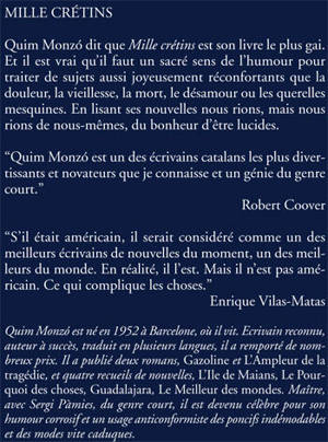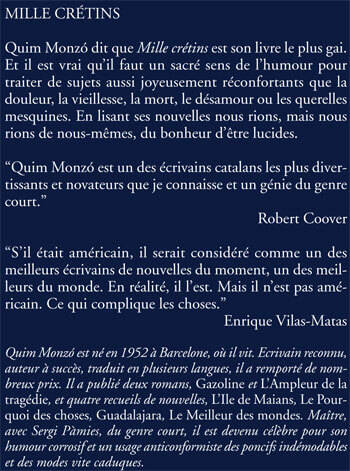 Quim Monzó dit que Mille crétins est son livre le plus gai. Et il est vrai qu'il faut un sacré sens de l'humour pour traiter de sujets aussi joyeusement réconfortants que la douleur, la vieillesse, la mort, le désamour ou les querelles mesquines. En lisant ses nouvelles nous rions, mais nous rions de nous-mêmes, du bonheur d'être lucides. "Quim Monzó est un des écrivains catalans les plus divertissants et novateurs que je connaisse et un génie du genre court." Robert Coover
