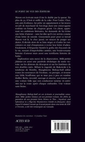 Exploration sans merci de la dépravation, «Mille petites falaises» est aussi une parabole drolatique de notre victoire sur les démons du désespoir et sur les fantômes de nos doubles ratés. Mêlant la rugosité de Bukowski à la tendresse de Hornby, Shaughnessy Bishop-Stall utilise toutes les ressources de l'écriture, ou presque, et trousse une fable bouffonne qui se mue peu à peu en sombre thriller. Riche, inventif, sauvage et sincère, son roman est une voiture folle que son conducteur ramène« in extremis» sur la route après chaque embardée. Une voiture sans freins.