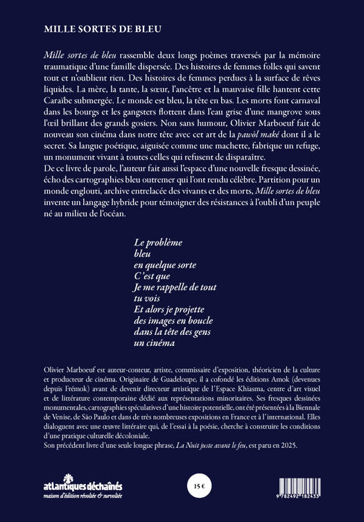 "Mille sortes de bleu" rassemble deux longs poèmes traversés par la mémoire traumatique d’une famille dispersée. Des histoires de femmes folles qui savent tout et n’oublient rien. Des histoires de femmes perdues à la surface de rêves liquides. La mère, la tante, la sœur, l’ancêtre et la mauvaise fille hantent cette Caraïbe submergée. Le monde est bleu, la tête en bas. Les morts font carnaval dans les bourgs et les gangsters flottent dans l’eau grise d’une mangrove sous l’œil brillant des grands gosiers. Non sans humour, Olivier Marboeuf fait de nouveau son cinéma dans notre tête avec cet art de la pawòl maké dont il a le secret. Sa langue poétique, aiguisée comme une machette, fabrique un refuge, un monument vivant à toutes celles qui refusent de disparaître. De ce livre de parole, l’auteur fait aussi l’espace d’une nouvelle fresque dessinée, écho des cartographies bleu outremer qui l’ont rendu célèbre. Partition pour un monde englouti, archive entrelacée des vivants et des morts, "Mille sortes de bleu" invente un langage hybride pour témoigner des résistances à l’oubli d’un peuple né au milieu de l’océan.