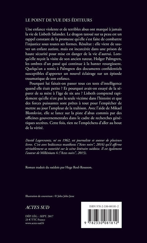 Une enfance violente et de terribles abus ont marqué à jamais la vie de Lisbeth Salander. Le dragon tatoué sur sa peau est un rappel constant de la promesse qu'elle s'est faite de combattre l'injustice sous toutes ses formes. Résultat : elle vient de sauver un enfant autiste, mais est incarcérée dans une prison de haute sécurité pour mise en danger de la vie d'autrui. Lorsqu'elle reçoit la visite de son ancien tuteur, Holger Palmgren, les ombres d'un passé qui continue à la hanter resurgissent. Quelqu'un a remis à Palmgren des documents confidentiels susceptibles d'apporter un nouvel éclairage sur un épisode traumatique de son enfance. Pourquoi lui faisait-on passer tous ces tests d'intelligence quand elle était petite ? Et pourquoi avait-on essayé de la séparer de sa mère à l'âge de six ans ? Lisbeth comprend rapidement qu'elle n'est pas la seule victime dans l'histoire et que des forces puissantes sont prêtes à tout pour l'empêcher de mettre au jour l'ampleur de la trahison. Avec l'aide de Mikael Blomkvist, elle se lance sur la piste d'abus commis par des officines gouvernementales dans le cadre de recherches génétiques secrètes. Cette fois, rien ne l'empêchera d'aller au bout de la vérité.