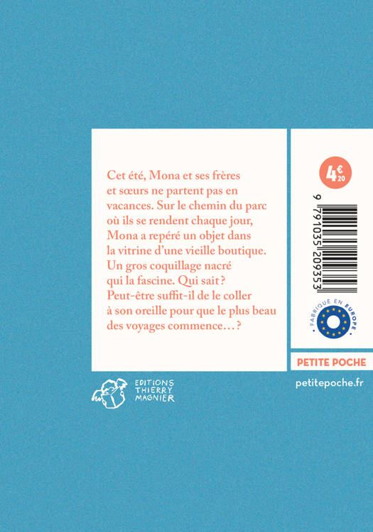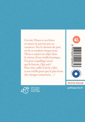 Cet été, Mona et ses frères et soeurs ne partent pas en vacances. Sur le chemin du parc où ils se rendent chaque jour, Mona a repéré un objet dans la vitrine d'une vieille boutique. Un gros coquillage nacré qui la fascine. Qui sait ? Peut-être suffit-il de le coller à son oreille pour que le plus beau des voyages commence... ?