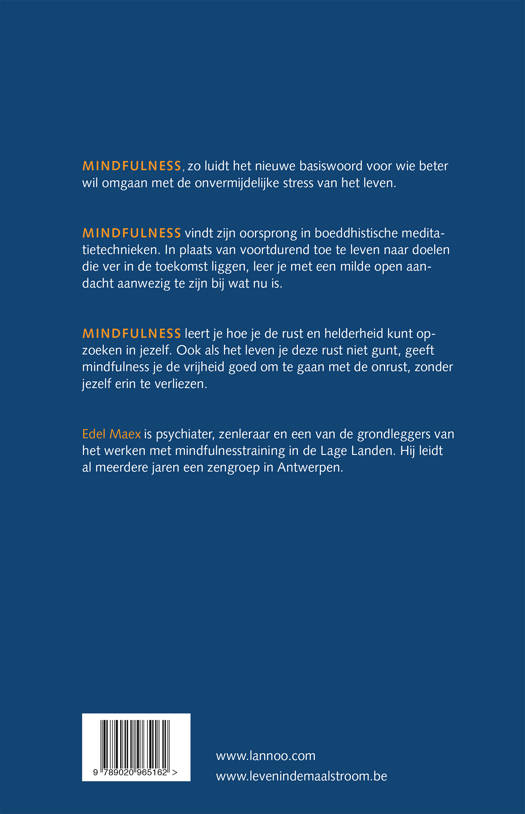 In Mindfulness leer je hoe je steeds weer de rust en helderheid in jezelf kunt opzoeken. Ook wanneer het leven je deze rust niet gunt, leer je zo goed mogelijk om te gaan met wat zich aandient. Edel Maex, psychiater in het ZNA Middelheim, Antwerpen, geeft al jaren, aan steeds grotere groepen mensen, trainingen in Mindfulness. MINDFULNESS, zo luidt het nieuwe basiswoord voor wie beter wil omgaan met de onvermijdelijke stress van het leven. MINDFULNESS vindt zijn oorsprong in boeddhistische meditatietechnieken. In plaats van voortdurend toe te leven naar doelen die ver in de toekomst liggen, leer je met een milde open aandacht aanwezig te zijn bij wat nu is. MINDFULNESS leert je hoe je de rust en helderheid kunt opzoeken in jezelf. Ook als het leven je deze rust niet gunt, geeft mindfulness je de vrijheid goed om te gaan met de onrust, zonder jezelf erin te verliezen.