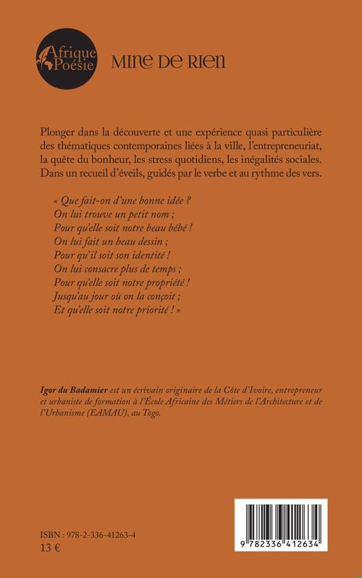 Plonger dans la découverte et une expérience quasi particulière des thématiques contemporaines liées à la ville, l'entrepreneuriat, la quête du bonheur, les stress quotidiens, les inégalités sociales. Dans un recueil d'éveils, guidés par le verbe et au rythme des vers. Que fait-on d'une bonne idée ? On lui trouve un petit nom; Pour qu'elle soit notre beau bébé ! On lui fait un beau dessin; Pour qu'il soit son identité ! On lui consacre plus de temps; Pour qu'elle soit notre propriété ! Jusqu'au jour où on la conçoit; Et qu'elle soit notre priorité !