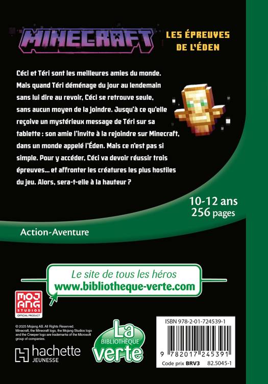 Céci et Téri sont les meilleures amies du monde. Mais quand Téri déménage du jour au lendemain sans lui dire au revoir, Céci se retrouve seule, sans aucun moyen de la joindre. Jusqu’à ce qu’elle reçoive un mystérieux message de Téri sur sa tablette : son amie l’invite à la rejoindre sur Minecraft, dans un monde appelé l’Éden. Mais ce n’est pas si simple. Pour y accéder, Céci va devoir réussir trois épreuves… et affronter les créatures les plus hostiles du jeu. Alors, sera-t-elle à la hauteur ?