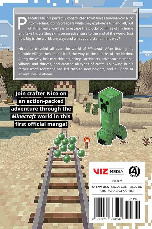 An official Minecraft manga adventure! Peaceful life in a perfectly constructed town bores ten-year-old Nico into mischief. Riding creepers while they explode is fun and all, but what he really wants is to escape the blocky confines of his home and take his crafting skills on an adventure to the end of the world. Just how big is the world, anyway, and what could possibly stand in his way?