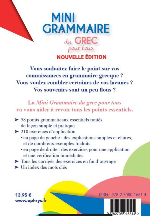 La Mini grammaire du grec s’adresse à tous ceux qui veulent revoir les points essentiels de la grammaire, faire le point sur leurs connaissances, ou combler des lacunes. Agrémentée de nouveaux chapitres et de nouveaux exercices, cette nouvelle édition, entièrement revue et remise au goût du jour, propose une soixantaine de fiches qui rappellent de façon simple et rapide les formes et les structures grammaticales. Retrouvez, en page de gauche, divers exemples traduits à l’appui, et, en page de droite, des exercices d’application avec leurs corrigés pour une vérification immédiate. Les renvois à des fiches complémentaires et un index grammatical sont à consulter en fin d’ouvrage pour une meilleure navigation.