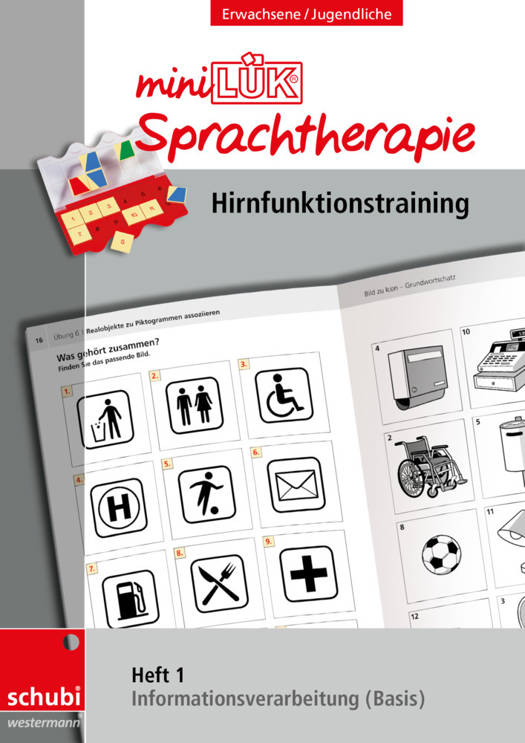 Kognition, Gedächtnis, Wahrnehmung, Orientierung, Konzentration, Aufmerksamkeit, exekutive Funktionen und Affektkontrolle haben sprachunterstützende Funktion. Die Arbeitshefte der Reihe 'miniLÜK® Sprachtherapie Hirnfunktionstraining' können in der logopädischen Therapie mit Erwachsenen und Jugendlichen mit Aphasie, Dysarthrie oder kognitiver Dysphasie eingesetzt werden. Sie ersetzen kein spezielles neuropsychologisches Training, sondern unterstützen als allgemeine Übungen in der Sprachtherapie die Basis des Sprachabrufs.