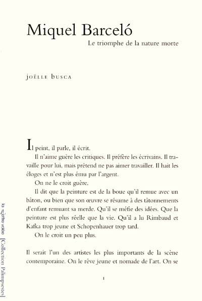 Contemporain de Jean-Charles Blais, Enzo Cucchi, Julian Schnabel ou Anselm Kiefer, l'art de Miquel Barceló s'ancre néanmoins dans la tradition ibérique de l'exil (Miró, Picasso), du matiérisme (Tapiès), de la noirceur picturale (Goya), de l'excès (el Greco). Au-delà de la figure de l'artiste peintre qu'il se construit dans l'itinérance, se profile une cosmogonie organique hantée par le thème de la désintégration. De là sa fascination pour l'Afrique où se mêlent saynètes de la vie ordinaire et lieux communs en un triomphe de la nature morte Joëlle Busca est critique d'art, commissaire d'expositions et directrice artistique de collections privées. Docteur en esthétique (Paris I Sorbonne), elle est spécialisée en art africain contemporain.