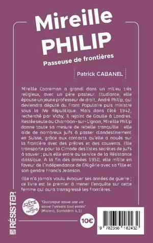 Mireille Cooreman a grandi dans un milieu très religieux, avec un père pasteur. Etudiante, elle épouse un jeune professeur de droit, André Philip, qui deviendra député du Front Populaire puis ministre sous la IVe République. Mais dans l'été 1942, recherché par Vichy, il rejoint de Gaulle à Londres. Restée seule au Chambon-sur-Lignon, Mireille Philip donne toute sa mesure de rebelle tranquille : elle aide de nombreux juifs à passer clandestinement en Suisse, grâce aux contacts qu'elle a noués sur la frontière avec des prêtres et des couvents. Elle transporte pour la Cimade des listes secrètes de juifs à sauver ; puis elle entre au service de la Résistance classique. A la fin des années 1950, elle milite en faveur de l'indépendance de l'Algérie avec sa fille et son gendre Francis Jeanson. Elle n'a jamais voulu évoquer ses années de guerre ; ce livre est le premier à mener l'enquête sur cette femme qui aura transgressé les frontières.