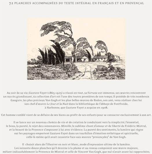 Il choisit alors de l'illustrer en noir et blanc, mode d'expression ultime de la lumière. Les soixante-douze planches qu'il dessine à la plume et au roseau composent une oeuvre majeure, mêlant indissolublement la Provence de Mistral et celle de Vincent Van Gogh, que nul n'avait avant lui rapprochées.