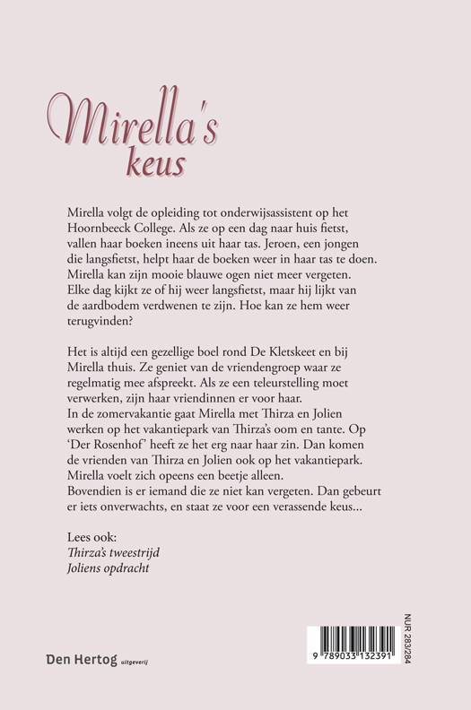 Mirella volgt de opleiding tot onderwijsassistent op het Hoornbeeck College. Als ze op een dag naar huis fietst, vallen haar boeken ineens uit haar tas. Jeroen, een jongen die langsfietst, helpt haar de boeken weer in haar tas te doen. Mirella kan zijn mooie blauwe ogen niet meer vergeten. Elke dag kijkt ze of hij weer langsfietst, maar hij lijkt van de aardbodem verdwenen te zijn. Hoe kan ze hem weer terugvinden? Het is altijd een gezellige boel rond De Kletskeet en bij Mirella thuis. Ze geniet van de vriendengroep waar ze regelmatig mee afspreekt. Als ze een teleurstelling moet verwerken, zijn haar vriendinnen er voor haar. In de zomervakantie gaat Mirella met Thirza en Jolien werken op het vakantiepark van Thirza's oom en tante. Op 'Der Rosenhof' heeft ze het erg naar haar zin. Dan komen de vrienden van Thirza en Jolien ook op het vakantiepark. Mirella voelt zich opeens een beetje alleen. Bovendien is er iemand die ze niet kan vergeten. Dan gebeurt er iets onverwachts, en staat ze voor een verrassende keus...