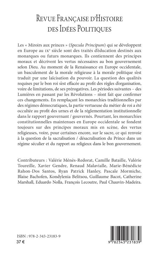 Les Miroirs aux princes (Specula Principum) qui se développent en Europe au ixe siècle sont des traités d'éducation destinés aux monarques. Ils contiennent des principes moraux et décrivent les vertus nécessaires au bon gouvernement selon Dieu. A la Renaissance, un basculement de la morale religieuse à la morale politique s'est traduit par une laïcisation du pouvoir. La question des qualités requises par le bon roi s'est effacée au profit des règles d'organisation, voire de limitations, de ses prérogatives. Les périodes suivantes n'ont fait que confirmer ces changements. En remplaçant les monarchies traditionnelles par des démocraties, la partie vertueuse du métier de roi a été occultée au profit des urnes et de la réglementation institutionnelle dans le rapport gouvernant / gouvernés. Pourtant, les monarchies constitutionnelles se fondent toujours sur des principes moraux, des vertus religieuses, voire sur le sacre, ce qui renvoie à la question de la sacralisation / désacralisation du Prince dans un régime séculier et du rapport au religieux dans le bon gouvernement.