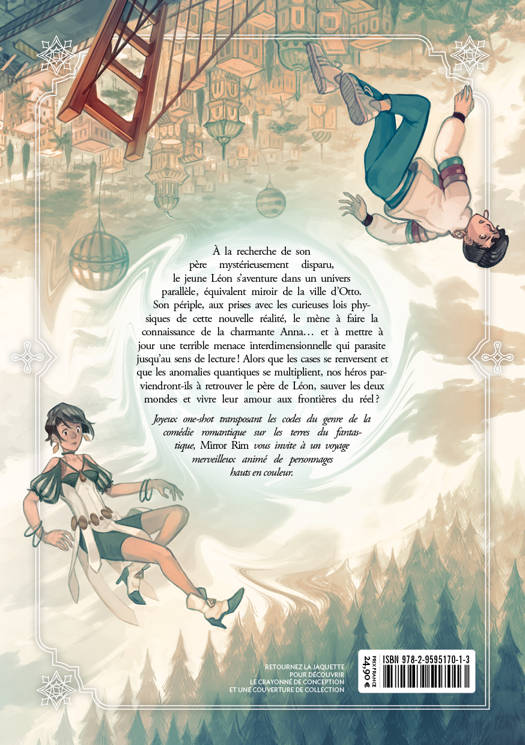 À la recherche de son père mystérieusement disparu, le jeune Léon s’aventure dans un univers parallèle, équivalent miroir de la ville d’Otto. Son périple, aux prises avec les curieuses lois physiques de cette nouvelle réalité, le mène à faire la connaissance de la charmante Anna... et à mettre à jour une terrible menace interdimensionnelle qui parasite jusqu’au sens de lecture ! Alors que les cases se renversent et que les anomalies quantiques se multiplient, nos héros parviendront-ils à retrouver le père de Léon, sauver les deux mondes et vivre leur amour aux frontières du réel ? Joyeux one-shot transposant les codes du genre de la comédie romantique sur les terres du fantastique, Mirror Rim vous invite à un voyage merveilleux animé de personnages hauts en couleur.