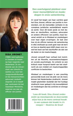 Al vanaf het begin van haar carrière gaat het Disa Jironet, officier van justitie in Amsterdam, om de menselijke verhalen in de complexe juridische werkelijkheid waarin zij werkt. Voor dit boek sprak ze met daders en slachtoffers, rechters, advocaten en andere officieren van justitie, maar bovenal vertelt ze in Misdaad en mededogen over haar eigen ervaringen. Ze laat zien hoe zij als officier namens de samenleving in elke strafzaak op zoek gaat naar de kern en hoe ze daarbij open blijft staan voor zowel het leed van het slachtoffer als dat van de dader en de maatschappij.