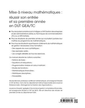 Cet ouvrage s’adresse à tous les lycéens ambitionnant d’intégrer un DUT Gestion des entreprises et des administrations (GEA) ou Techniques de commercialisation (TC), ainsi qu’aux étudiants de première année qui souhaitent parfaire leur maîtrise du programme de mathématiques. Il intéressera enfin tous les étudiants ayant besoin d’éléments de mathématiques de gestion nécessaires à leur formation.