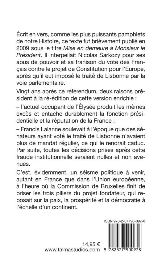 Écrit en vers, comme les plus puissants pamphlets de notre Histoire, ce texte fut brièvement publié en 2009 sous le titre "Mise en demeure à Monsieur le Président". Il interpelait Nicolas Sarkozy pour ses abus de pouvoir et sa trahison du vote des Français contre le projet de Constitution pour l'Europe, après qu'il eut imposé le traité de Lisbonne par la voie parlementaire. Vingt ans après ce référendum, deux raisons président à la ré-édition de cette version enrichie : - l'actuel occupant de l'Élysée produit les mêmes excès et entache durablement la fonction présidentielle et la réputation de la France ; - Francis Lalanne soulevait à l'époque que des sénateurs ayant voté le traité de Lisbonne n'avaient plus de mandat régulier, ce qui le rendrait caduc. Par suite, toutes les décisions prises après cette fraude institutionnelle seraient nulles et non avenues. C'est, évidemment, un séisme politique à venir, autant en France que dans l'Union européenne, à l'heure où la Commission de Bruxelles finit de briser les trois piliers du projet fondateur, qui reposait sur la paix, la prospérité et la démocratie à l'échelle d'un continent.