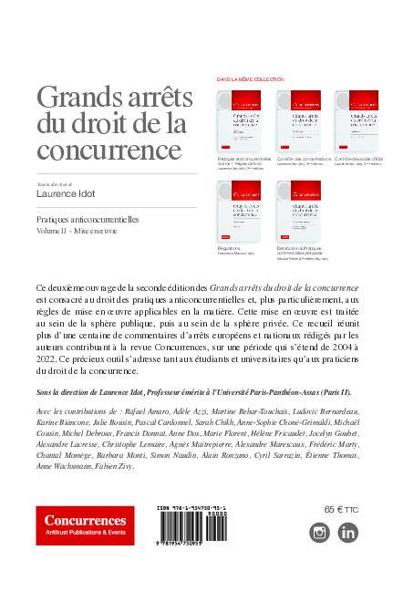 Ce deuxième ouvrage de la seconde édition des Grands arrêts du droit de la concurrence est consacré au droit des pratiques anticoncurrentielles et, plus particulièrement, aux règles de mise en oeuvre applicables en la matière. Cette mise en oeuvre est traitée au sein de la sphère publique, puis au sein de la sphère privée. Ce recueil réunit plus d'une centaine de commentaires d'arrêts européens et nationaux rédigés par les auteurs contribuant à la revue Concurrences, sur une période qui s'étend de 2004 à 2022. Ce précieux outil s'adresse tant aux étudiants et universitaires qu'aux praticiens du droit de la concurrence.