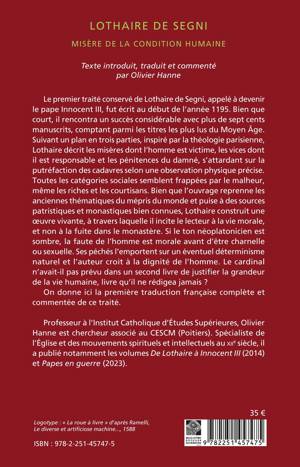 Le premier traité conservé de Lothaire de Segni, appelé à devenir le pape Innocent III, fut écrit au début de l’année 1195. Bien que court, il rencontra un succès considérable avec plus de sept cents manuscrits, comptant parmi les titres les plus lus du Moyen Âge. Suivant un plan en trois parties, inspiré par la théologie parisienne, Lothaire décrit les misères dont l’homme est victime, les vices dont il est responsable et les pénitences du damné, s’attardant sur la putréfaction des cadavres selon une observation physique précise. Toutes les catégories sociales semblent frappées par le malheur, même les riches et les courtisans. Bien que l’ouvrage reprenne les anciennes thématiques du mépris du monde et puise à des sources patristiques et monastiques bien connues, Lothaire construit une oeuvre vivante, à travers laquelle il incite le lecteur à la vie morale, et non à la fuite dans le monastère. Si le ton néoplatonicien est