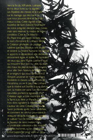 Le « De Miseria », écrit en 1195, annonce dans son prologue un livre sur la dignité humaine. Ce seront « les Mystères des messes » et le traité sur le mariage, qui décrivent ce que nous pouvons être et faire de mieux. Cette dignité exige que, d'abord, « le lépreux se présente au prêtre, et avoue à haute voix sa mésellerie », son état : telle est la crudité désolante du « De Miseria ». Bien qu'il existe des saintes et des saints, nul n'est pur et innocent. Déclarer ouvertement, avec honte mais sans retenue, quelques misères suffit. Figurons-nous Lothaire, tel un Job ecclésiaste grattant ses ulcères avec un tesson du Temple détruit, décrivant la Création profanée : un paysage sublime que des poisseux ont souillé et sinistré. La misère humaine ne connait ni apports ni déperdition, elle demeure atrocement égale et stable. L'auteur de cette Création ne saurait l'avoir profanée après l'avoir sanctifiée. Le « De Miseria » supplie le Sauveur de venir sans plus tarder.