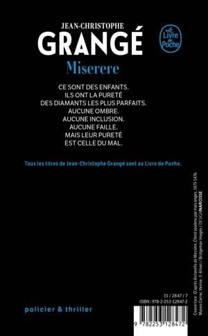 CE SONT DES ENFANTS. ILS ONT LA PURETÉ DES DIAMANTS LES PLUS PARFAITS. AUCUNE OMBRE. AUCUNE INCLUSION. AUCUNE FAILLE. MAIS LEUR PURETÉ EST CELLE DU MAL.C'est toujours un piège d'ouvrir un roman de Jean-Christophe Grangé. On se dit qu'on va juste en humer les premières pages et puis, bing !, en un clin d'oeil, vous voilà pris au piège, cramponné au fort volume qui fi le à cent à l'heure. AL. F., Livres Hebdo.Il y a là de quoi leurrer les plus éprouvés des lecteurs de Grangé. Et assez d'ombre pour les contenter. Alexis Brocas, Le Figaro Magazine.