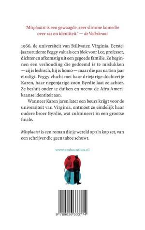 Misplaatst’ is de weergaloze roman van Nell Zink, bekend van ‘De rotskruiper’. 1966, Stillwater College, Virginia. Eerstejaarsstudente Peggy valt als een blok voor Lee, professor, dichter en afkomstig uit een gegoede familie. Ze beginnen een verhouding die gedoemd is te mislukken – zij is lesbisch, hij is homo – maar die pas na tien jaar eindigt. Peggy vlucht met haar driejarige dochtertje Karen, haar negenjarige zoon Byrdie laat ze achter. Ze besluit onder te duiken en neemt de Afro-Amerikaanse identiteit aan. Wanneer Karen jaren later een beurs krijgt voor de universiteit van Virginia, ontmoet ze eindelijk haar oudere broer Byrdie, wat culmineert in een grootse finale. ‘Misplaatst’ is een opwindende roman van Nell Zink, die geen taboe schuwt. ‘‘Misplaatst’ is een Great American Novel.’ – The Telegraph