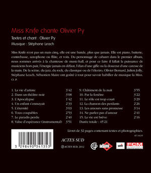 Miss Knife est un personnage de cabaret créé par Olivier Py, un travesti qui a pour références Marlène, Barbara ou Juliette. Voici quinze nouvelles chansons, douloureuses ou insolentes, dix ans après son premier tour de chant et ses ballades espiègles et poétiques.