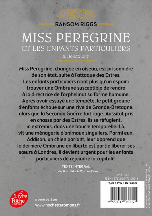 Miss Peregrine, changée en oiseau, est prisonnière de son état, suite à l’attaque des Estres. Les enfants particuliers n’ont plus qu’un espoir : trouver une Ombrune susceptible de rendre à la directrice de l’orphelinat sa forme humaine. Après avoir essuyé une tempête, le petit groupe d’enfants échoue sur une rive de Grande-Bretagne, alors que la Seconde Guerre fait rage. Aussitôt pris en chasse par des Estres, ils se réfugient, in extremis, dans une boucle temporelle. Là, vit une ménagerie d’animaux singuliers. Parmi eux, Addison, un chien parlant, leur apprend que la dernière Ombrune en liberté est partie libérer ses sœurs à Londres. Il devient urgent pour les enfants particuliers de rejoindre la capitale.