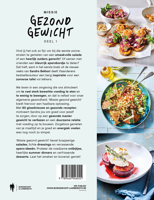 Vind jij het ook zo fijn om bij die eerste zonnestralen te genieten van een smaakvolle salade of een heerlijk zuiders gerecht? Of samen met vrienden een kleurrijk aperobordje te delen? Dat treft, want in het eerste boek uit de nieuwe reeks van Sandra Bekkari deelt Vlaanderens bestsellerauteur een berg inspiratie voor een zomerse tafel vol lekkers. We leven in een omgeving die ons stimuleert om te veel sterk bewerkte voeding te eten en te weinig te bewegen, en dat is nefast voor onze algemene gezondheid. ‘Missie gezond gewicht’ biedt hiervoor een haalbare oplossing. Met 80 gloednieuwe en gezonde recepten motiveert Sandra jou om goed voor jezelf te zorgen, door op een gezonde manier gewicht te verliezen en een duurzame relatie met voeding op te bouwen. Zorgeloos genieten van je maaltijd en je goed en energiek voelen was nog nooit zo simpel. ‘Missie gezond gewicht’ bevat knapperige salades, lichte dressings en verrassende apero-ideeën. Probeer de voedzame ontbijtjes, heerlijke summer dinners en verfrissende desserts. Laat het smaken en bovenal: geniet!