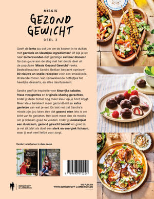Geeft de lente jou ook zin om de keuken in te duiken met gezonde en kleurrijke ingrediënten? Of kijk je uit naar zomeravonden met gezellige summer dinners? Ga dan gauw aan de slag met het derde deel uit de populaire ‘Missie Gezond Gewicht’-reeks. Bestsellerauteur Sandra Bekkari bedacht opnieuw 80 nieuwe en snelle recepten voor een smaak volle, stralende zomer. Van verkwikkende ontbijtjes tot heerlijke desserts, en alles daartussenin. Sandra geeft je inspiratie voor kleurrijke salades, frisse vinaigrettes en originele sharing-gerechten, zodat jij deze zomer nog meer kleur op je bord krijgt. Meer kleur betekent meer gezondheid en dus extra genieten van wat je eet. En laat net dat Sandra’s missie zijn: jou laten zien dat gezond eten iets is om écht van te genieten. Het loont meer dan de moeite om je lichaam goed te voeden, zodat jij makkelijker een duurzaam, gezond gewicht bereikt en goed in je vel zit. Met als doel een sterk en energiek lichaam, waar jij met veel liefde voor zorgt.