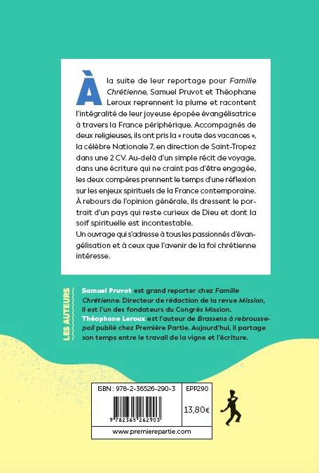 A la suite de leur reportage pour Famille Chrétienne, Samuel Pruvot et Théophane Leroux reprennent la plume et racontent l'intégralité de leur joyeuse épopée évangélisatrice à travers la France périphérique. Accompagnés de deux religieuses, ils ont pris la route des vacances, la célèbre Nationale 7, en direction de Saint-Tropez dans une 2 CV. Au-delà d'un simple récit de voyage, dans une écriture qui ne craint pas d'être engagée, les deux compères prennent le temps d'une réflexion sur les enjeux spirituels de la France contemporaine. A rebours de l'opinion générale, ils dressent le portrait d'un pays qui reste curieux de Dieu et dont la soif spirituelle est incontestable. Un ouvrage qui s'adresse à tous les passionnés d'évangélisation et à ceux que l'avenir de la foi chrétienne intéresse. AUTEURS Samuel Pruvot est grand reporter chez Famille Chrétienne. Directeur de rédaction de la revue Mission, il est l'un des fondateurs du Congrès Mission. Théophane Leroux est l'auteur de Brassens à rebrousse-poil publié chez Première Partie. Aujourd'hui, il partage son temps entre le travail de la vigne et l'écriture.