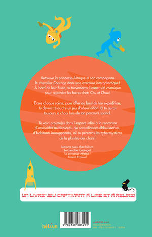 Retrouve la princesse Attaque et son compagnon le chevalier Courage dans une aventure intergalactique ! À bord de leur fusée, tu traverseras l'immensité cosmique pour rejoindre les frères chats Chu et Chuu ! Dans chaque scène, pour aller au bout de ton expédition, tu devras résoudre un jeu d'observation. Et tu auras toujours le choix lors de ton parcours spatial. Te voici projeté(e) dans l'espace infini à la rencontre d'astéroïdes multicolores, de constellations éblouissantes, d'habitants insoupçonnés, où tu perceras les cyber mystères de la planète des chats !